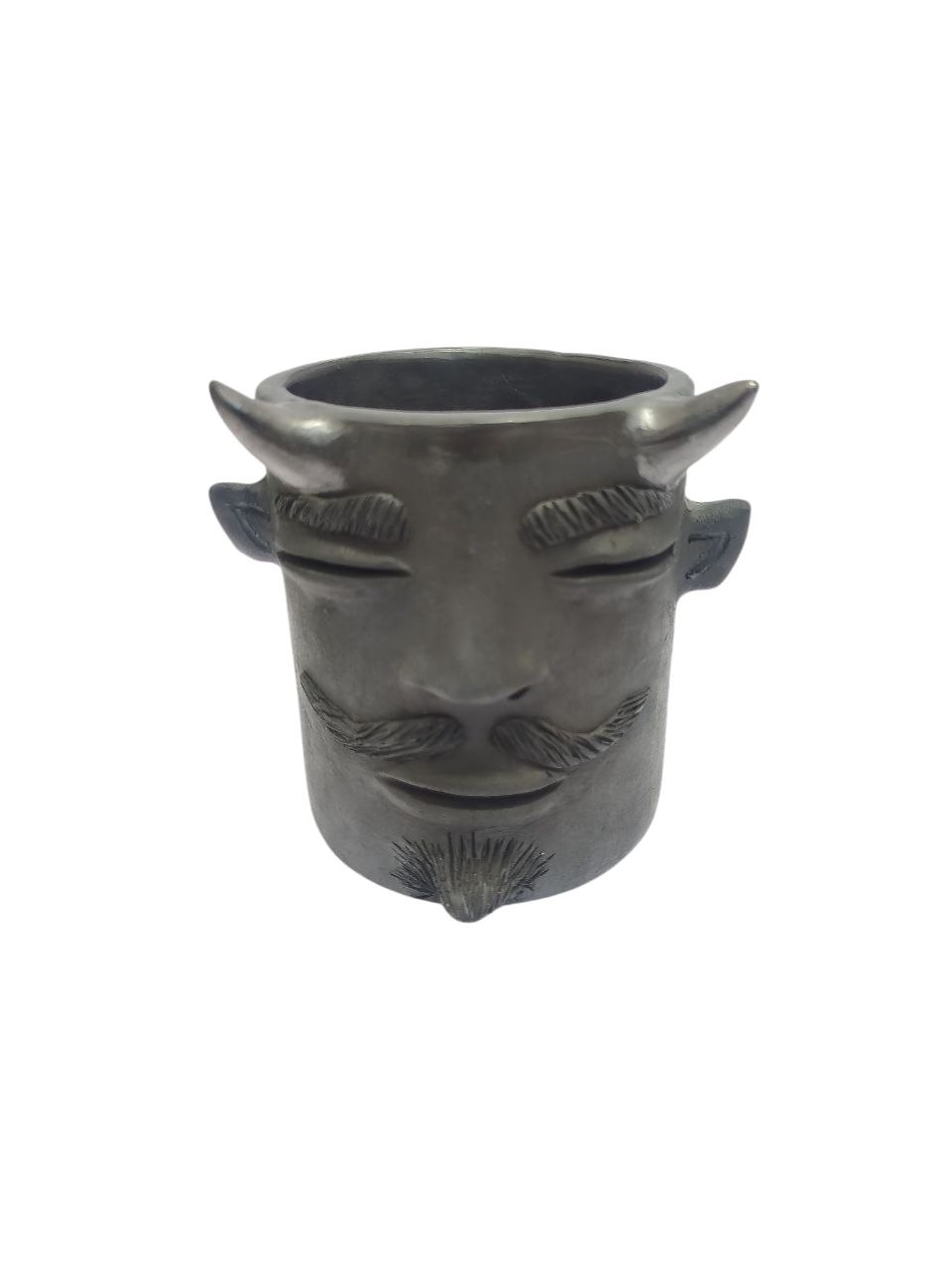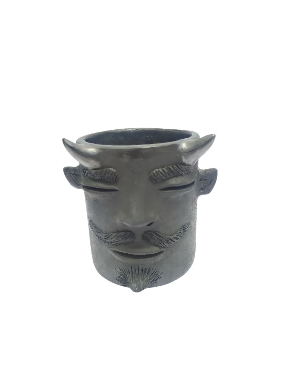 VASO CON ROSTRO DIABLO DE BARRO NEGRO (11CM), HECHO A MANO, ARTESANÍAS