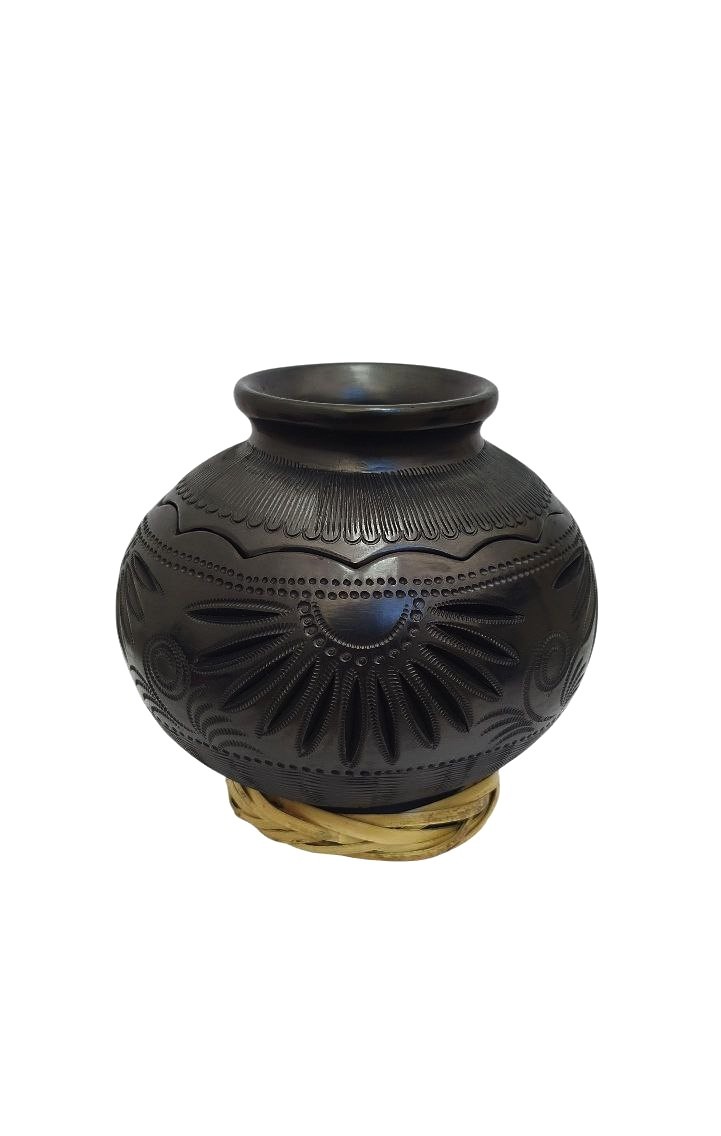 CÁNTARO DE BARRO NEGRO CALADO A MANO,OLLA EN ACABADO SEMI BRILLANTE (20CM), HECHA A MANO, FINA ARTESANÍA MEXICANA