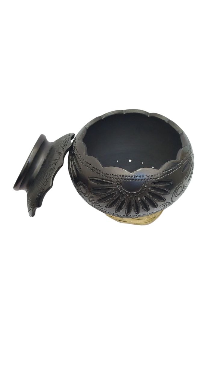 VASIJA DE BARRO NEGRO DE OAXACA (18 CM), CON TAPA DESMONTABLE, DECORACIÓN DE INTERIORES, HECHA A MANO, NO APTA PARA LÍQUIDOS.