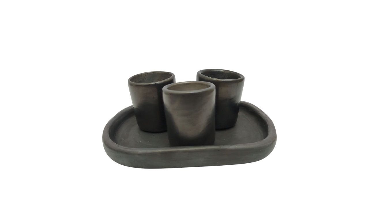 CHAROLA MATE DE BARRO NEGRO (18 CM) Y 3 TEQUILEROS SENCILLOS, SET ARTESANAL MEXICANO. OAXACA