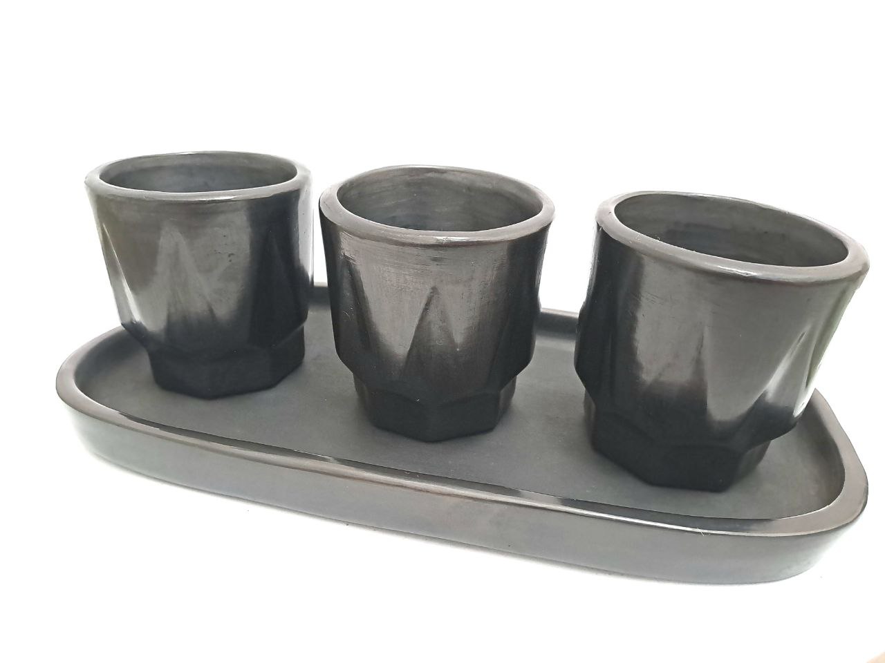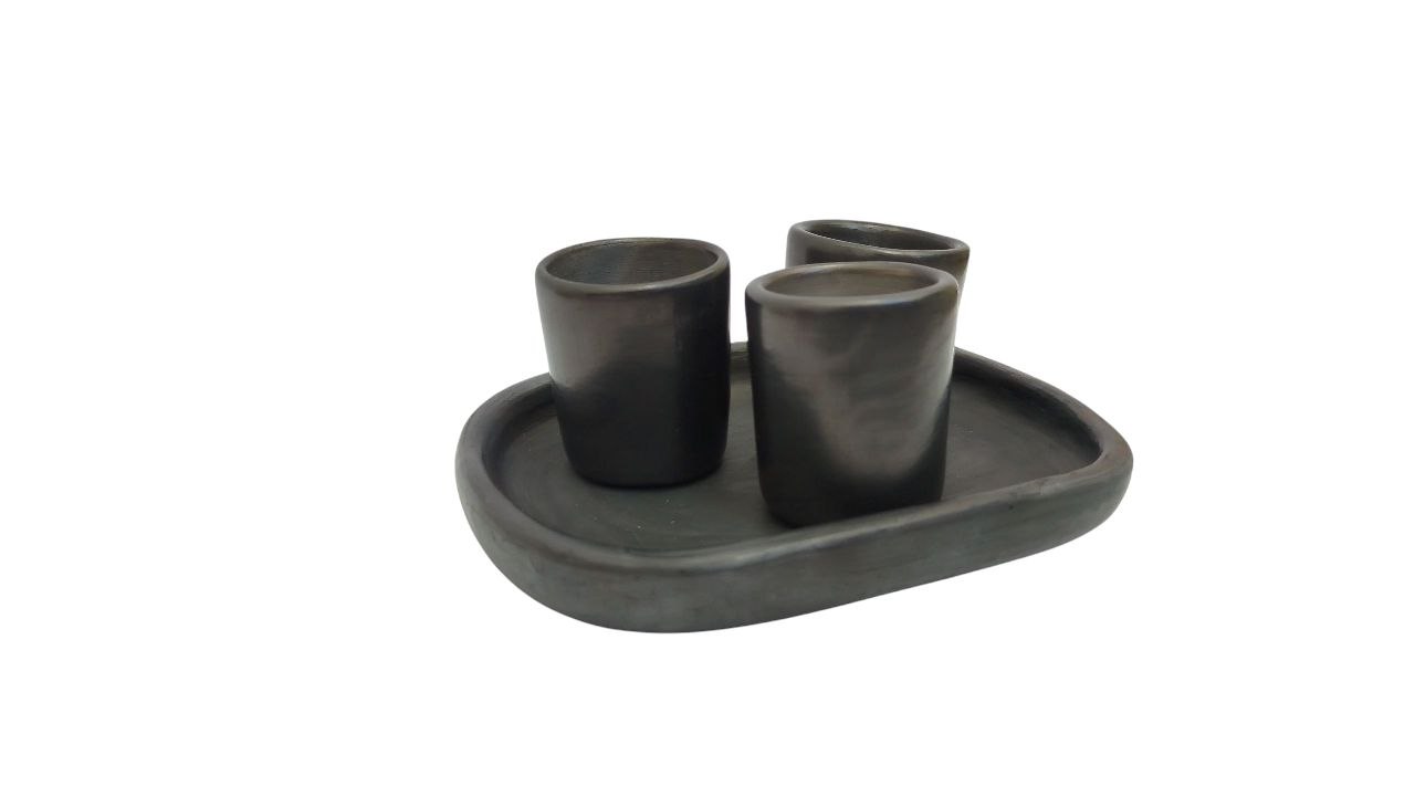 CHAROLA FINA ARTESANAL DE BARRO NEGRO(28CM) CON 3 COPAS TIPO WHISKY PULIDAS, HECHO EN OAXACA. ARTESANÍAS MEXICANAS