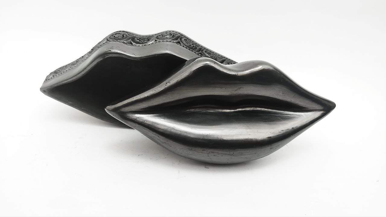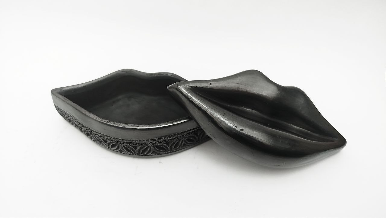 JOYERO DE BARRO NEGRO EN FORMA DE LABIOS CON BASE CALADA Y TAPA (17CM) ARTESANÍAS