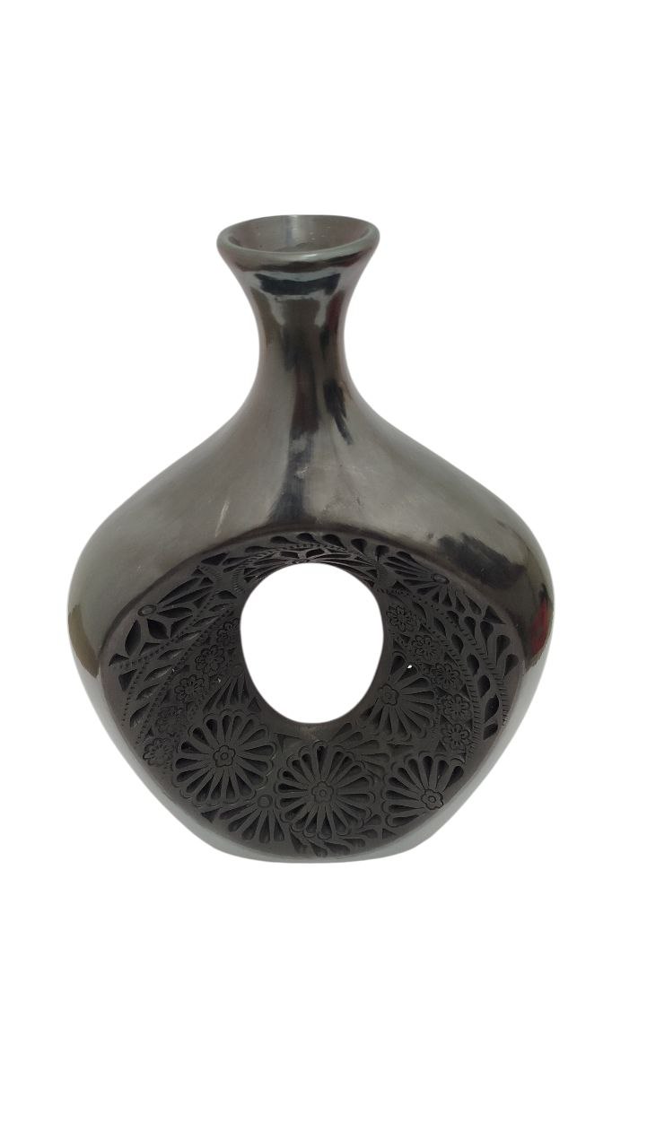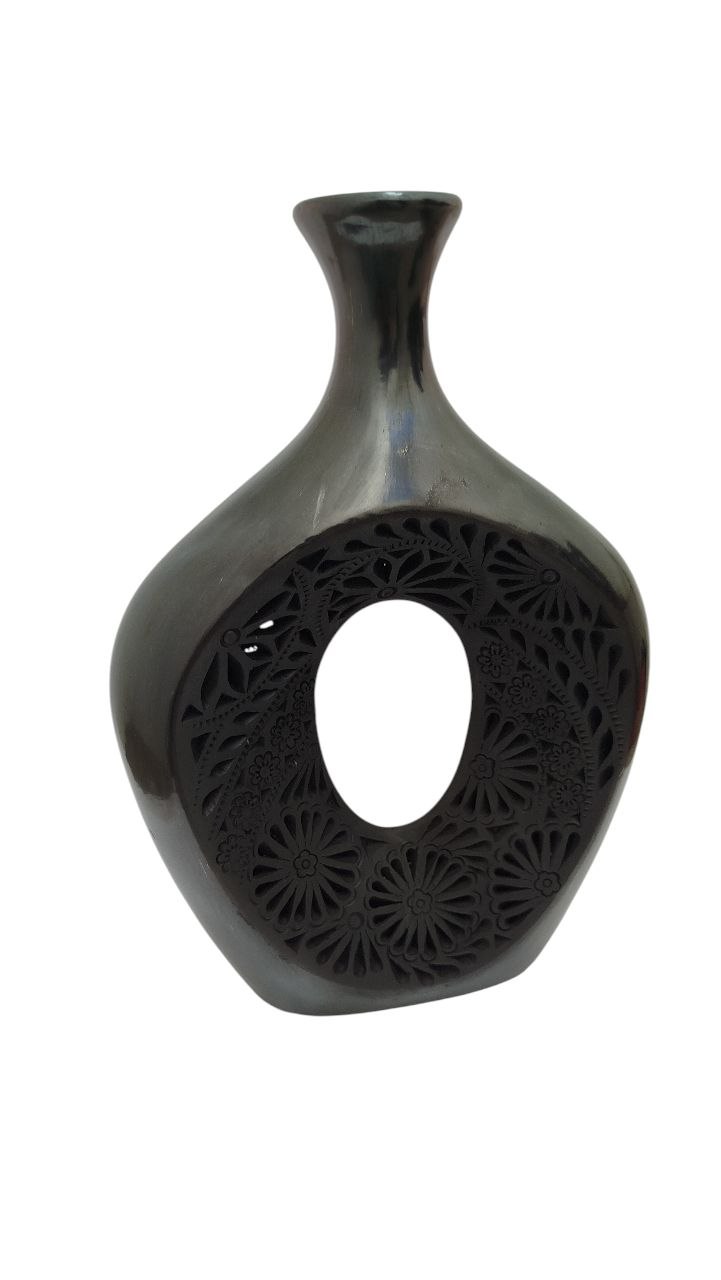 FLORERO FINO DOBLE CALADO DE BARRO NEGRO (29CM), ARTESANIA, HECHO A MANO.