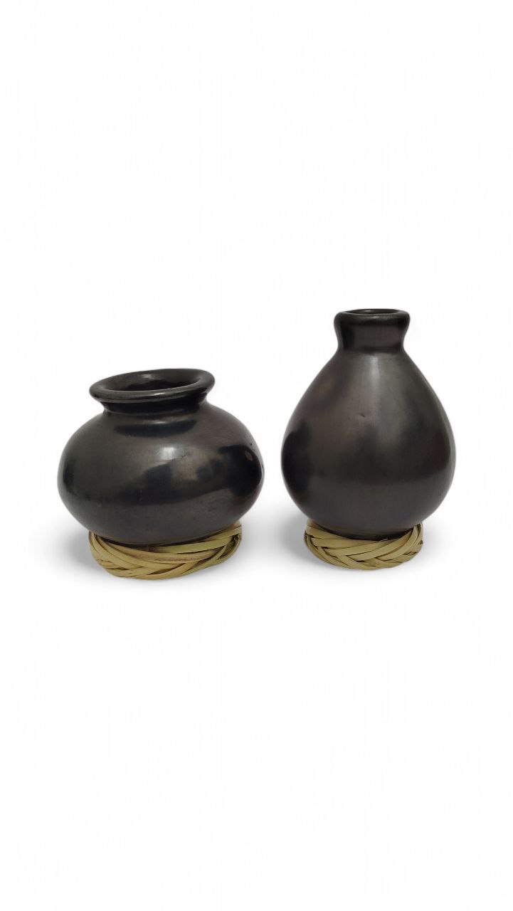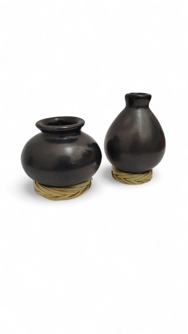 MINI CÁNTAROS DE BARRO NEGRO LISO PULIDO CON BASE DE CARRIZO (7 CM), ARTESANÍA, FINAS PIEZAS HECHAS A MANO EN OAXACA. (NO P/AGUA) LULA’ NAYA’ NI
