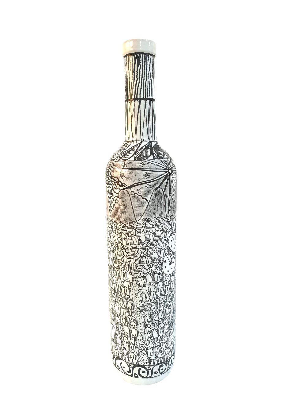 BOTELLA ARTESANAL DE 750 ML, PINTADA A MANO CON PAISAJE MEXICANO, BLANCO ¡Con bebida incluida!