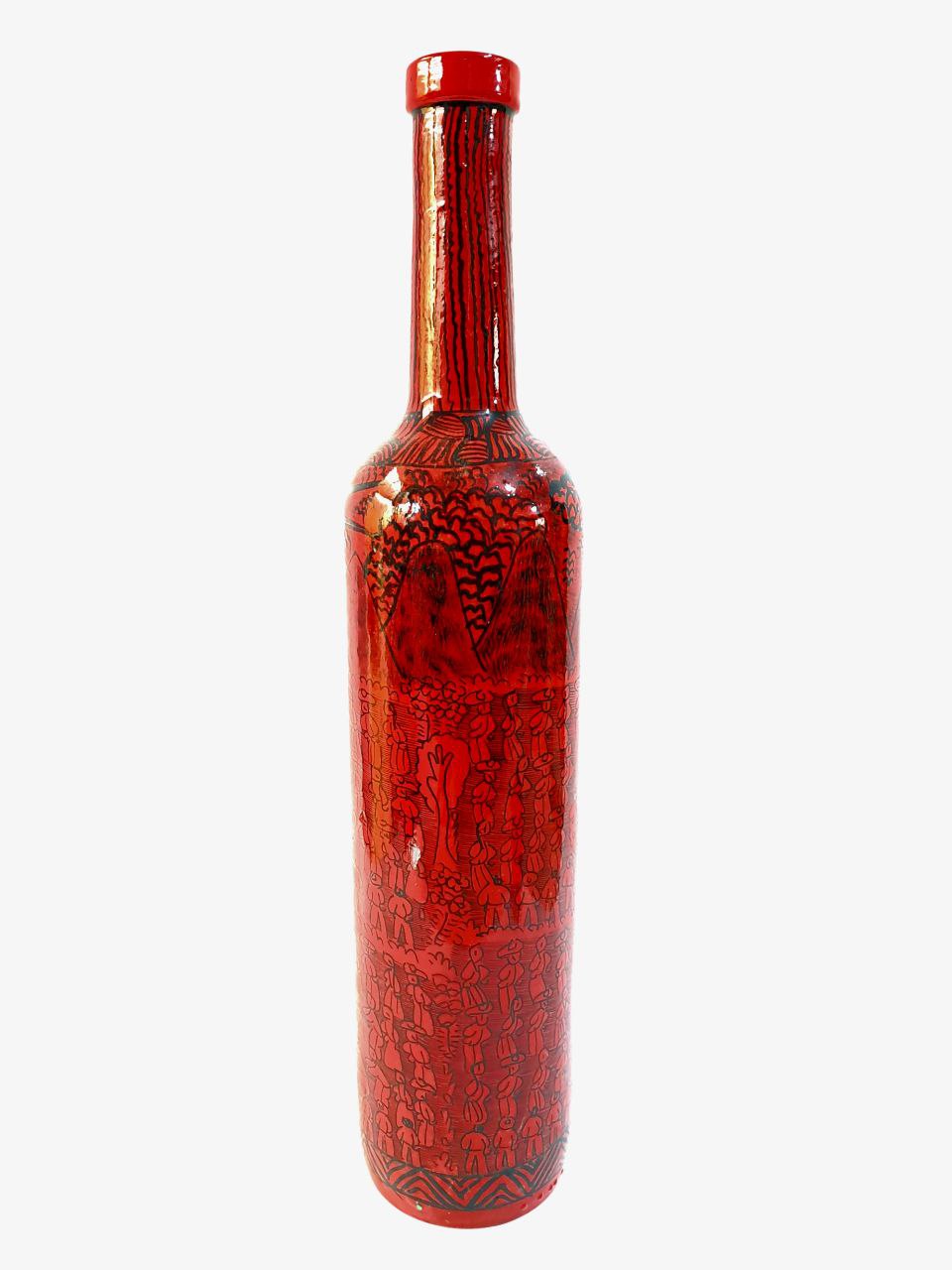 BOTELLA ARTESANAL DE 750 ML, PINTADA A MANO CON PAISAJE MEXICANO, TONO ROJO ¡Con bebida incluida!