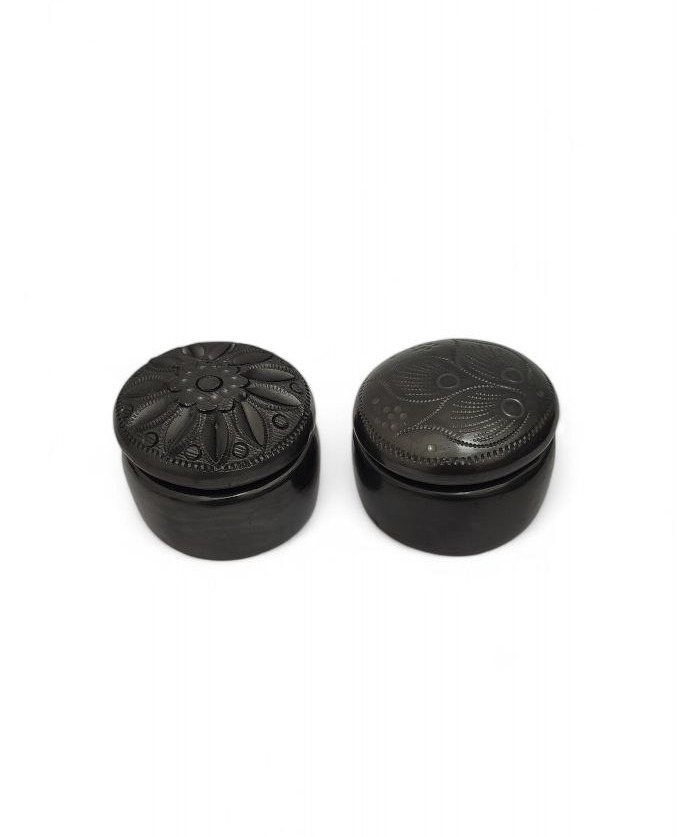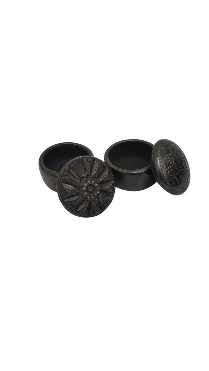 2 MINI ALHAJEROS CIRCULARES ARTESANAL DE BARRO NEGRO EN (5 CM), GRABADO EN LA TAPA, ARTESANÍAS MEXICANAS