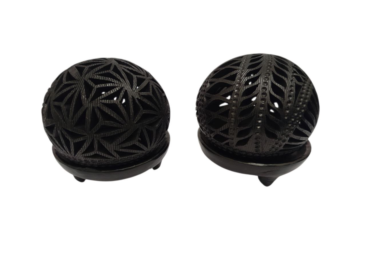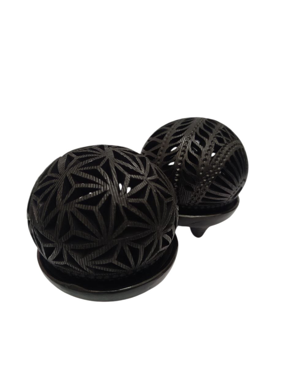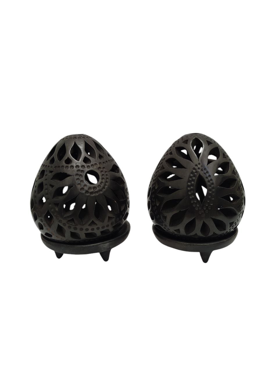 DÚO DE LÁMPARAS TIPO HUEVO DE BARRO NEGRO (11 CM), PANTALLAS CON CALADO Y BASE INCLUIDA. PARA PROYECTAR LUZ DE VELA, HECHO A MANO.