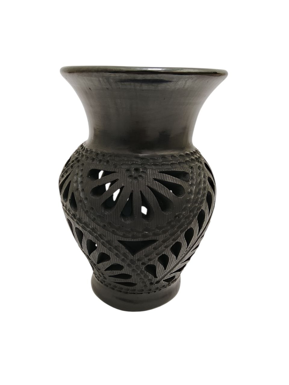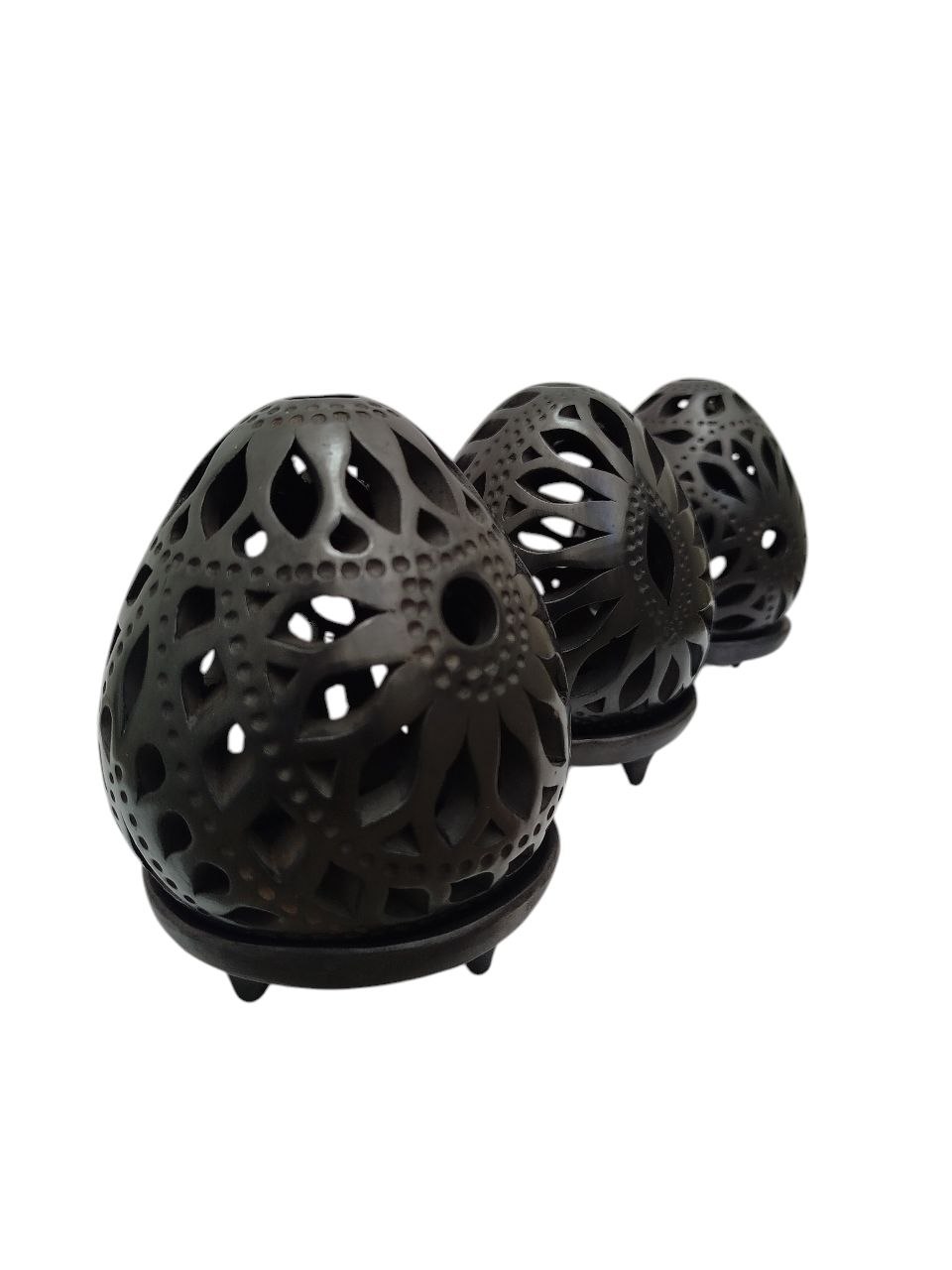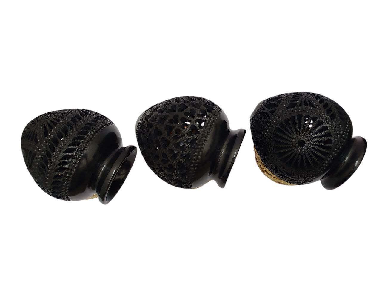 JUEGO DE LÁMPARAS DE BARRO NEGRO (11 CM), PANTALLAS CON CALADO Y BASE INCLUIDA. PARA PROYECTAR LUZ DE VELA, HECHO A MANO.