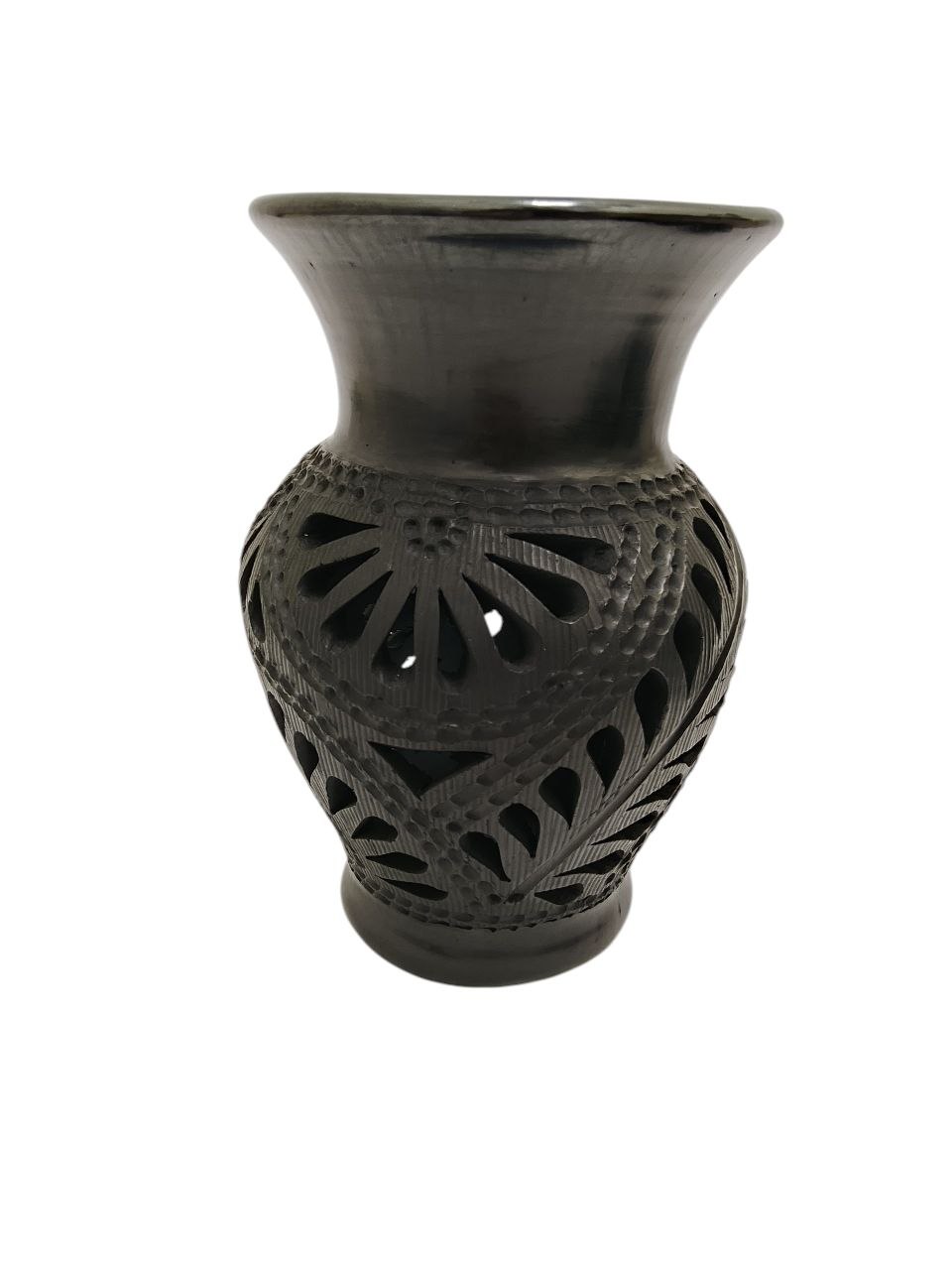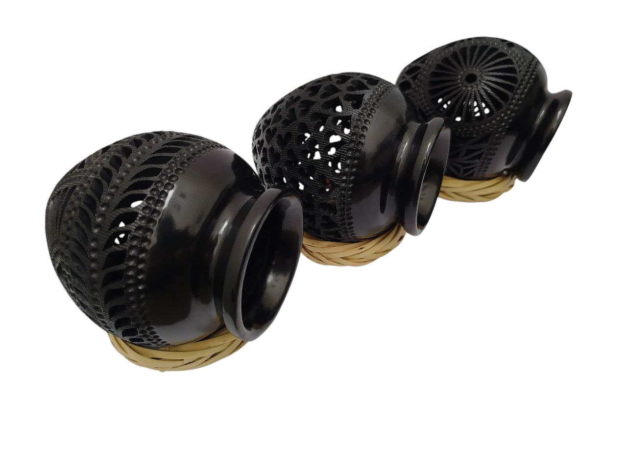 SET DE 3 CÁNTAROS CALADOS DE BARRO NEGRO (13 CM) CON BASE DE CARRIZO, ARTESANIA, DECORATIVO, HECHO A MANO, NO APTO P/AGUA.