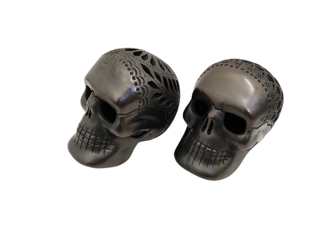 DÚO DE CALAVERA MEXICANA (10 CM), CRÁNEO ARTESANAL DE BARRO NEGRO, PARA DECORACION.