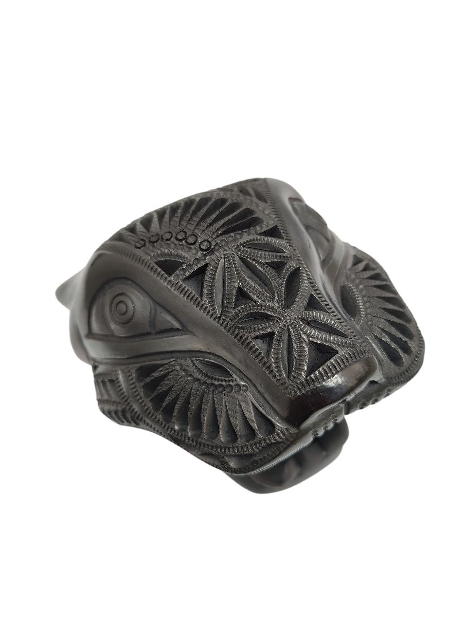 CABEZA DE JAGUAR MEXICANO, EN BARRO NEGRO DE OAXACA, CALADO Y BRUÑIDO.