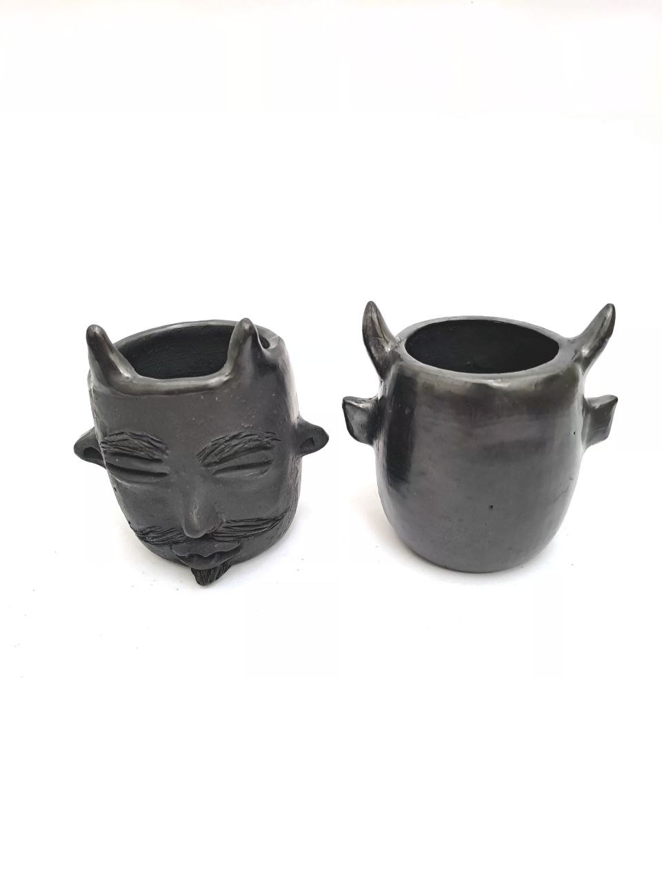 PAR DE VASITOS TEQUILEROS ARTESANALES DE BARRO NEGRO CON ROTRO DE DIABLO (7CM), DECORATIVOS, LULA´NAYA´NI.