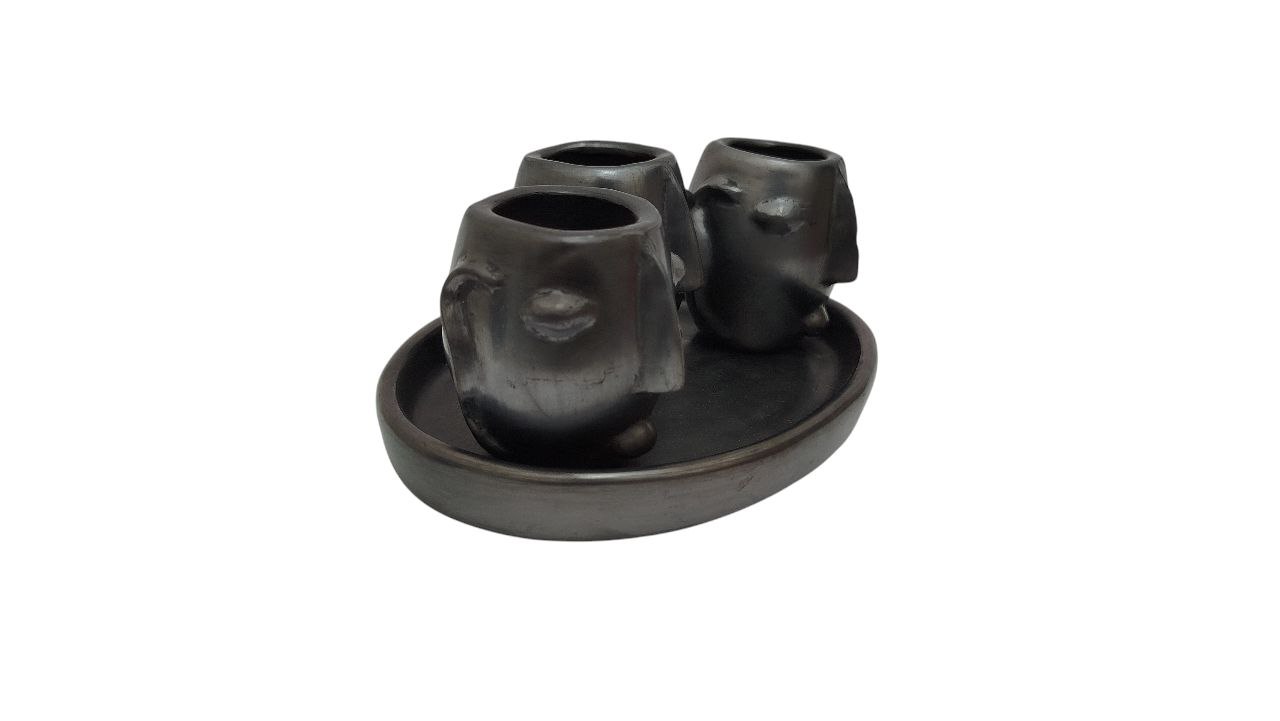 *Set de 3 vasitos mezcaleros / tequileros de Barro Negro con charola oavalada *Perfecto para convivir y degustar un buen mezcal o tequila. El set incluye: 3 Mezcaleros de 6.5 cm de altura, en acabado tono gris. Una charola mezcalera. La charola mide 22 cm * 10 cm. *Tomar en cuenta que el barro absorbe cierta cantidad de liquido. Recuerde: Es indispensable curar (lavar) los mezcaleros previo al uso.