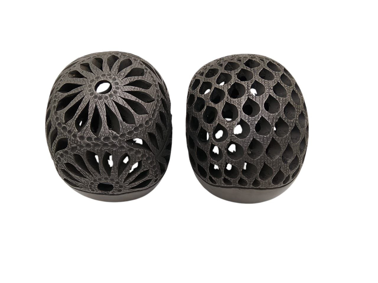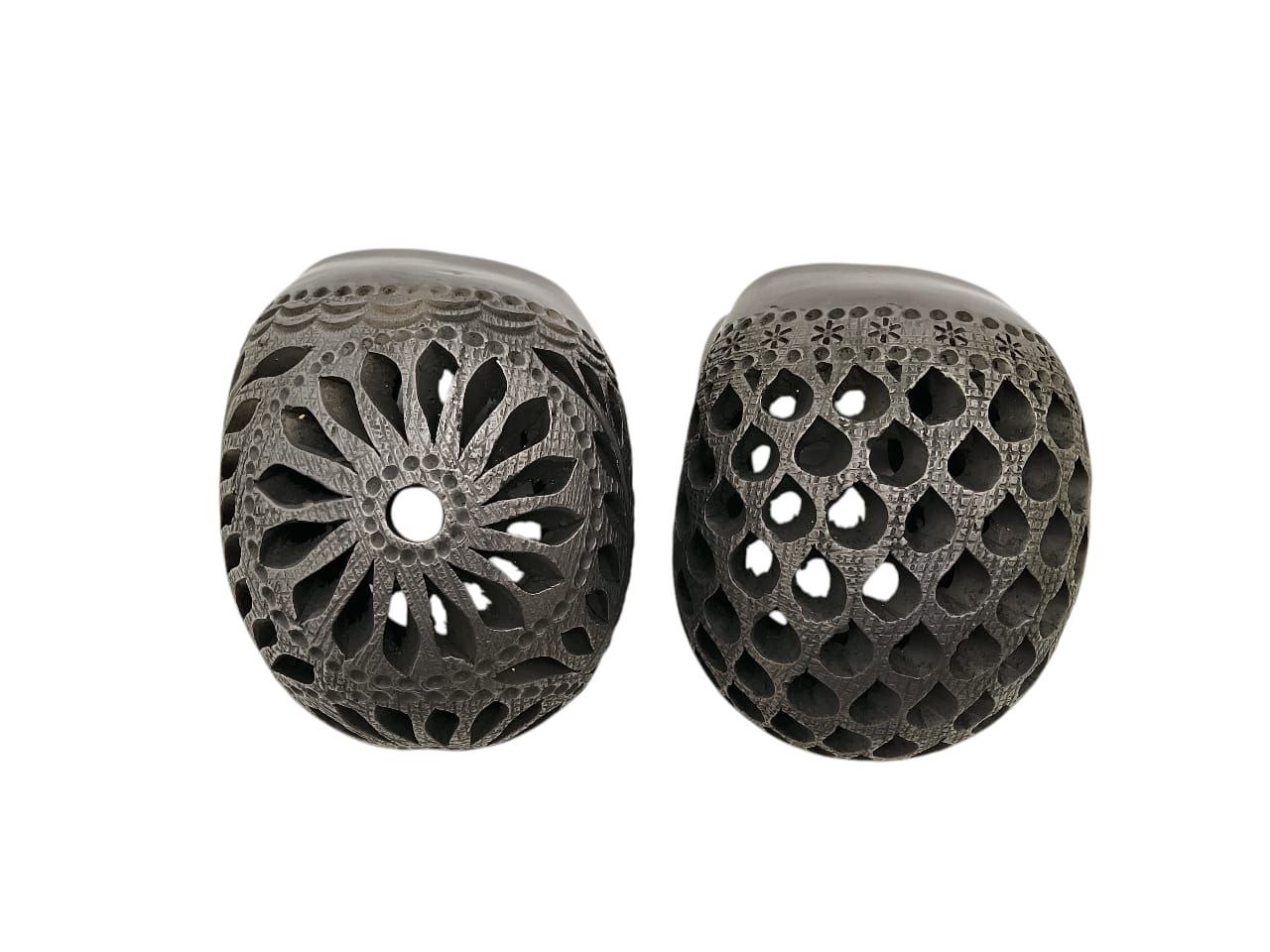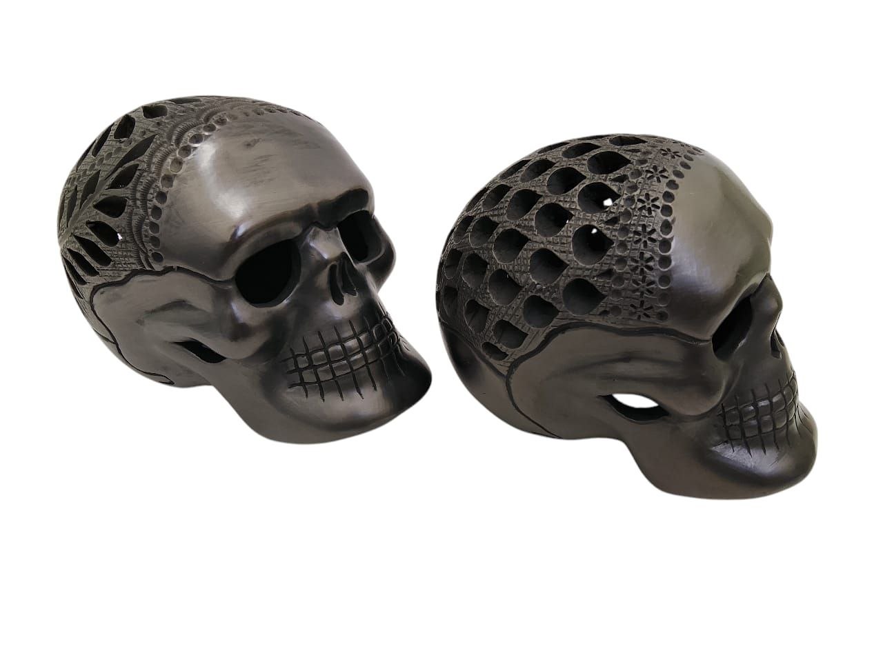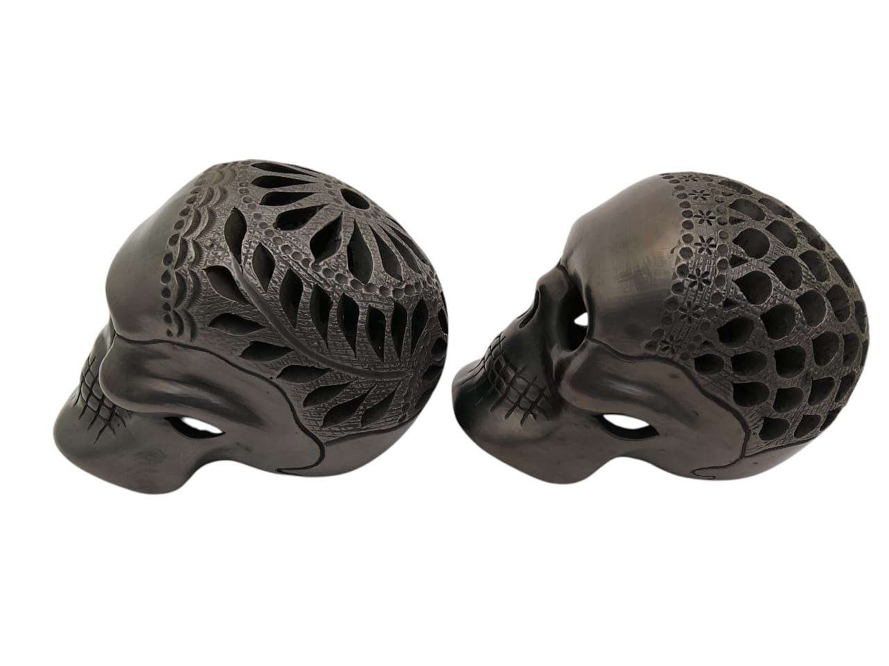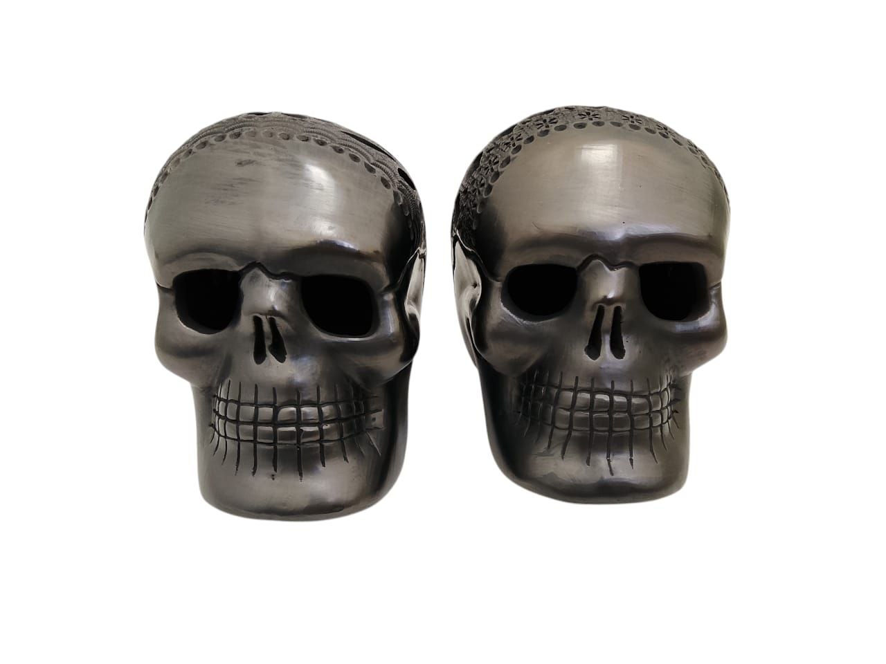 PAR DE CALAVERAS DE BARRO NEGRO DE 10cm LINDAS PARA DECORAR CUALQUIEN ESTANCIA. LOS CALADOS PUEDEN VARIAR MUY LEVEMENTE PEDENDIENDO EL STOCK. Medidas: 12 cm alt x 15 Lrgo x 11 cm anch