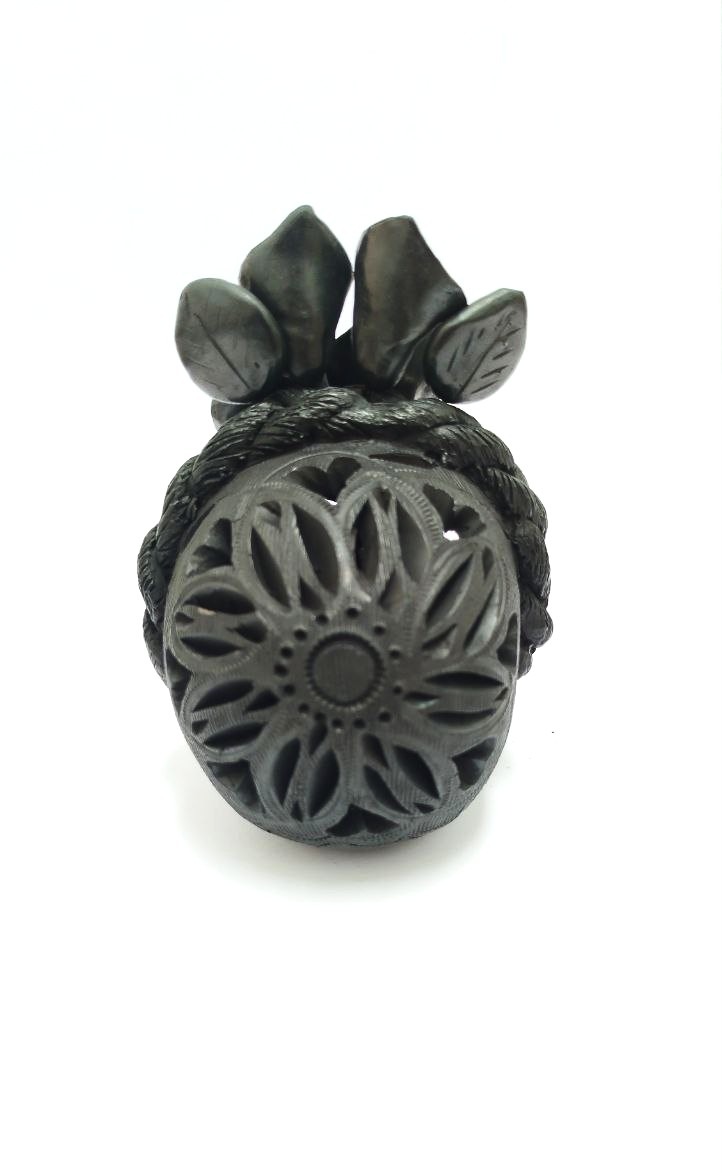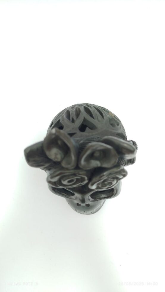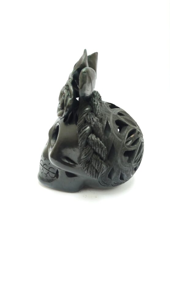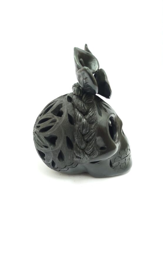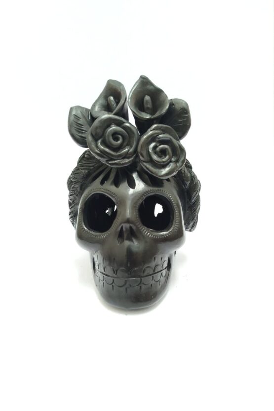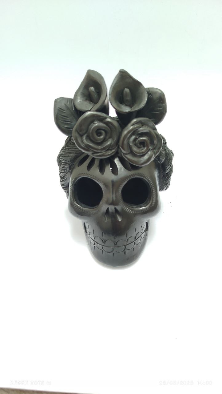 Calavera tipo Frida hecha a mano por artesanos de Oaxaca. Con una fina decoración de trenza con tocado de flores. La parte trasera simula cabello en tono mate, los ojos decorados con calado que acentúan su estilo mexicano, acabado semibrillante en la parte frontal. Pieza grande. Mide 13 cm de alto * 10 cm ancho * 9 ancho. Pieza especial del arte popular mexicano.