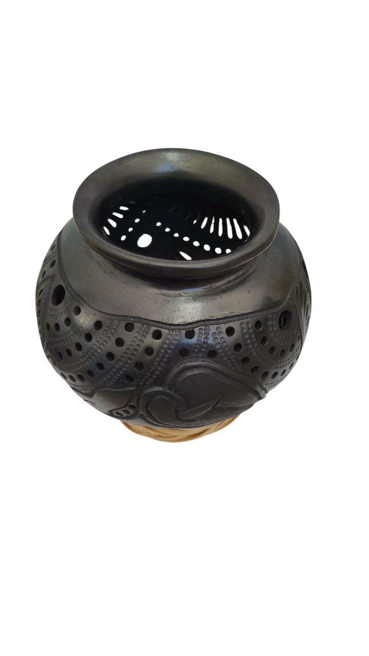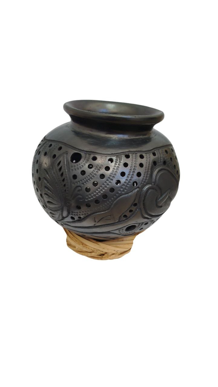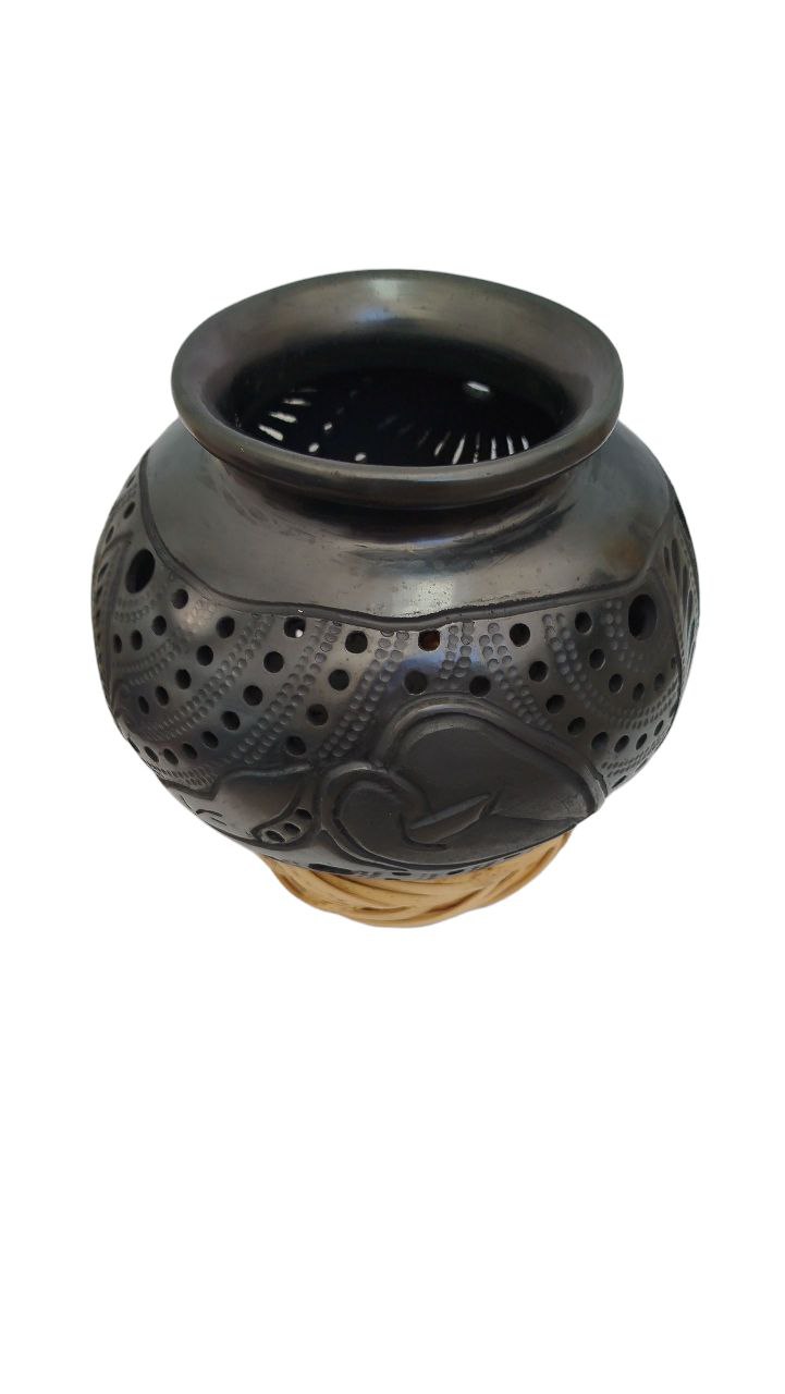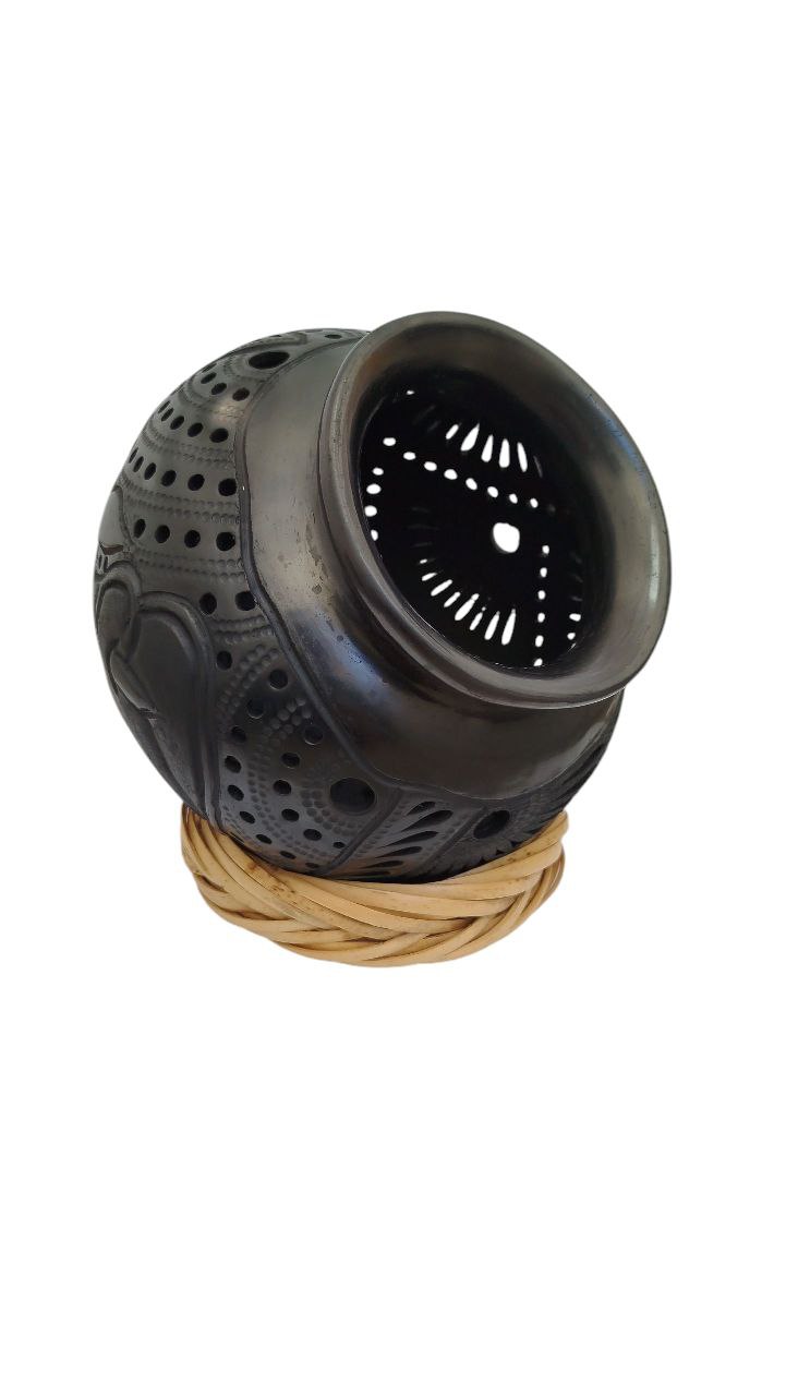 Precioso cántaro de Barro Negro, artesanía mexicana de estilo tradicional, minimalista. Pieza brillante, hecha a mano, acabado liso, calado especial, con base de carrizo, medida 20 cm de diámetro,no apto para almacenar líquidos. Diseño oaxaqueño de alta calidad, artesanías mexicanas Lula’ Naya’ Ni