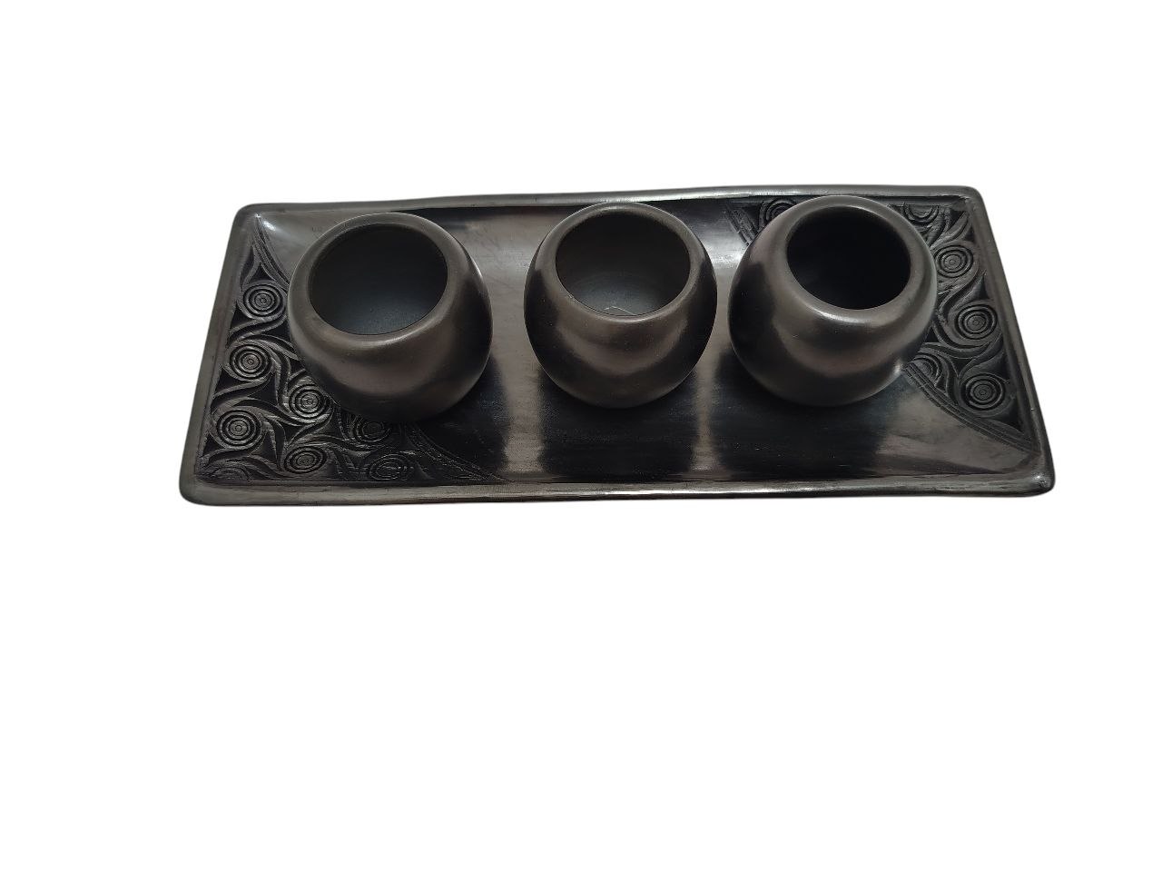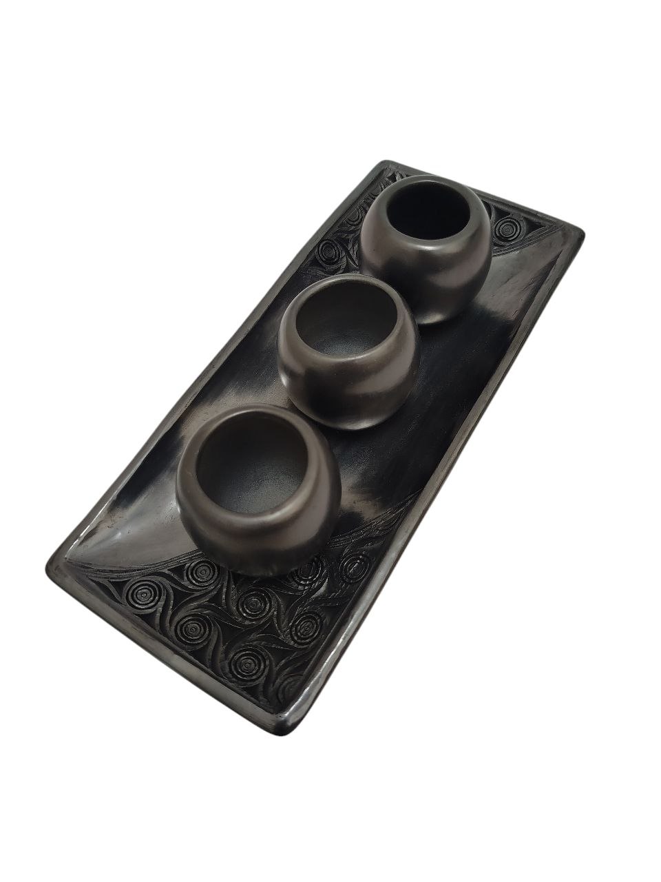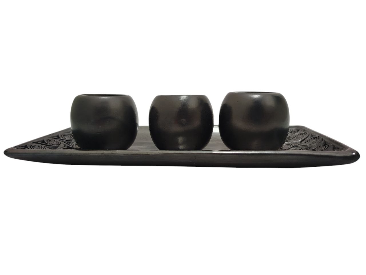 *Hechos de Barro Negro con charola grabada de forma transversal para mezcal.
