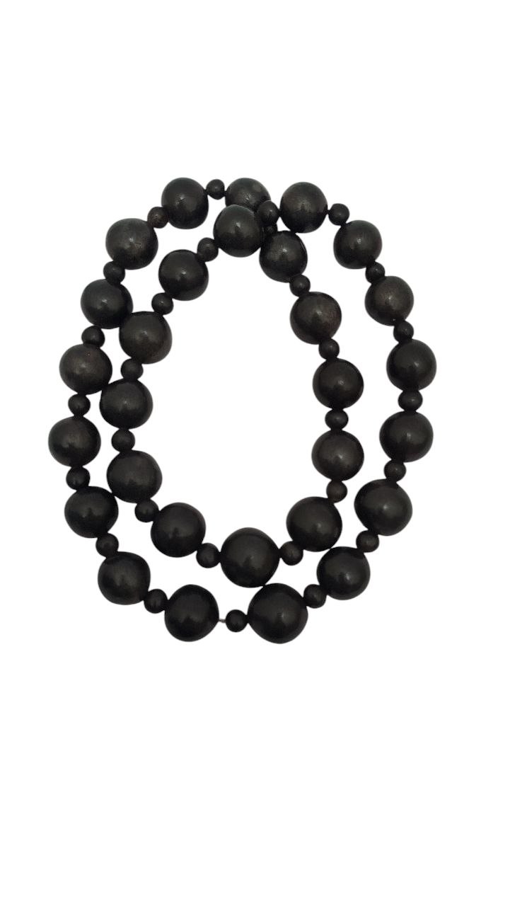 Collar y artesanal de barro negro, pieza elaborada a mano por artesanos de San Bartolo Coyotepec. 35 cm de largo, con hilo de plástico.