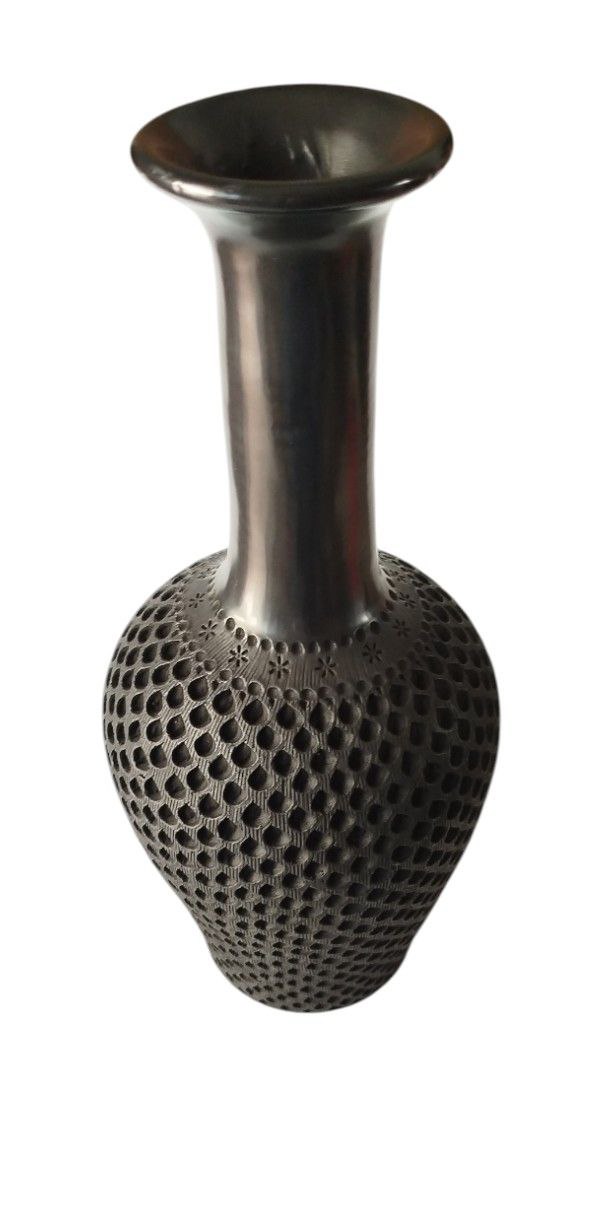 Precioso florero alto de calado de punto, hecho con la tradicional técnica ancestral del Barro Negro, la cual tiñe de manera natural las piezas de un color negro a través del proceso de cocción muy laborioso.