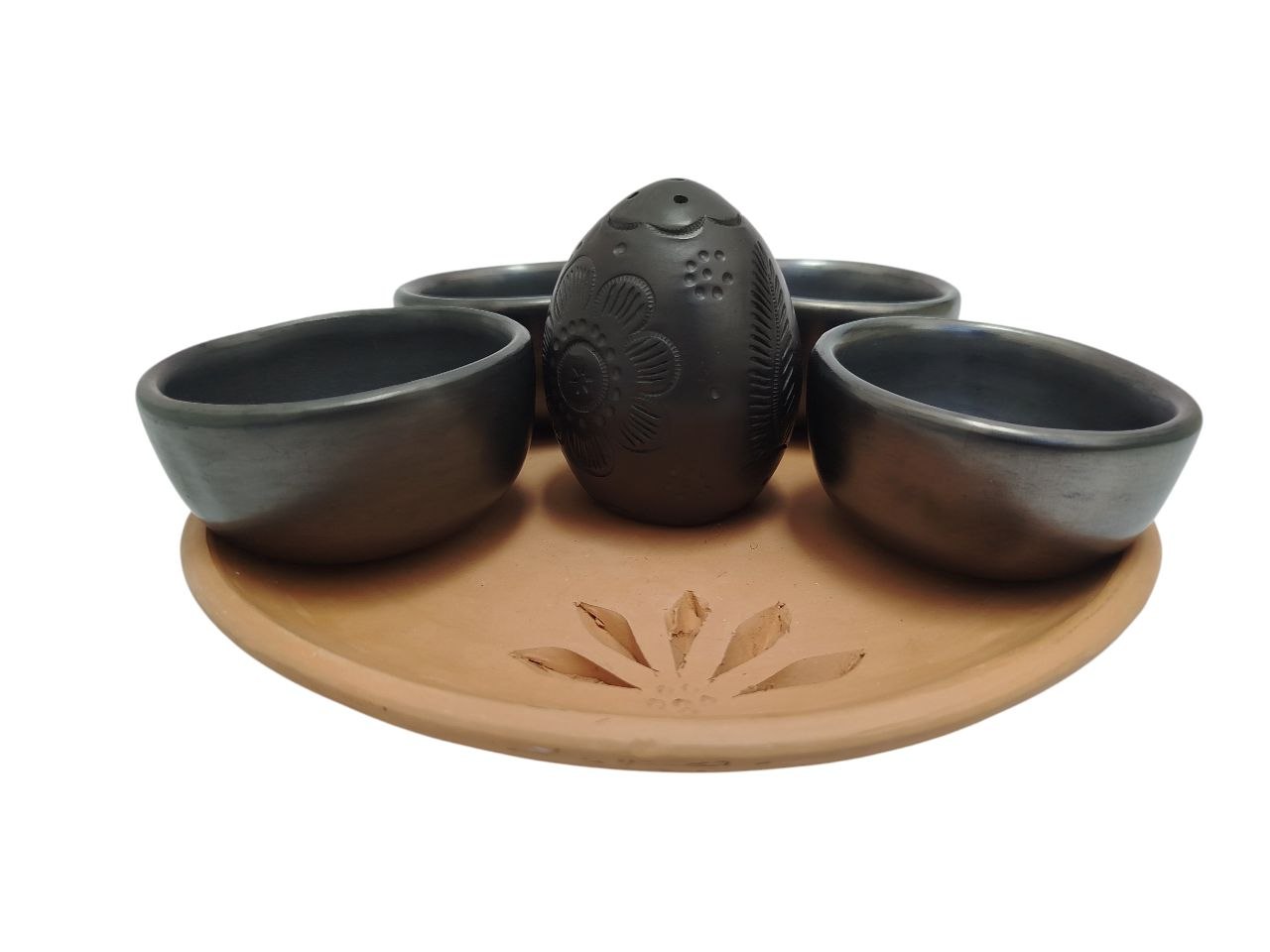 Set Mezcalero de Barro, que incluye 4 jicaras mezcaleras, un Salero huevito y plato plano minimalista de barro blanco. Este set de 6 piezas es más que una forma de disfrutar de esta bebida tradicional.