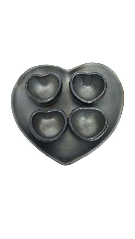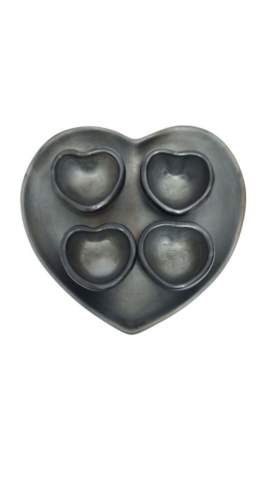 4 JICARAS MEZCALERAS DE BARRO Y PLATO BASE DE BARRO NEGRO EN FORMA DE CORAZON QUE PUEDE SERVIR PARA COLOCAR NARANJAS. MEDIDAS PLATO 20 CM Mezcalero 1.5 oz de capacidad
