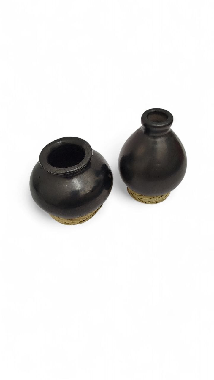 Par de Lindos mini cantaro de barro negro liso pulido con base de carrizo, para adornar tu hogar o como regalo de viaje. MEDIDAS: Cantaro largo 9.5 × 7.5 × 7 & Cantaro cincular 6.5 × 7.5 ×7.5 *No aptos para almacenar líquidos.