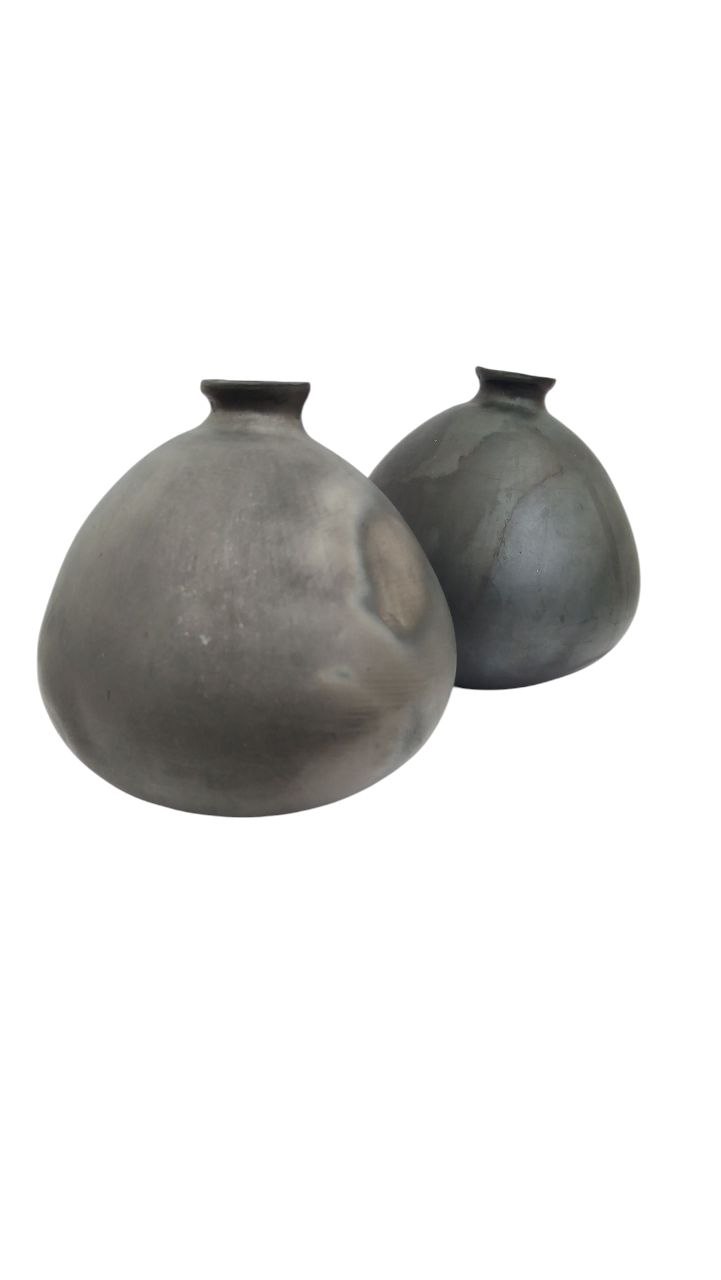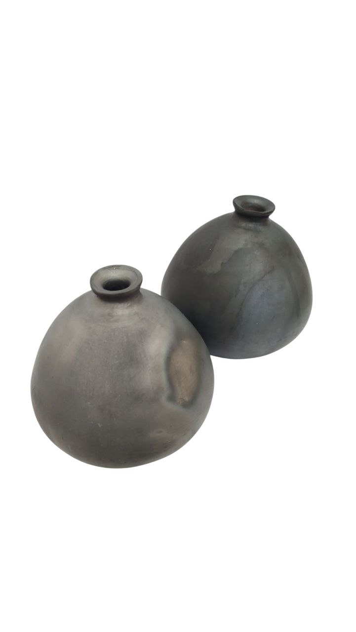 DOS ANFORAS DECORATIVAS DE BARRO NEGRO RUSTICO, PARA USAR COMO FLORERO O SIMPLEMENTE DECORATIVO. MEDIDAS: 14 cm de alto * 13 cm de ancho y 2 cm de diametro.