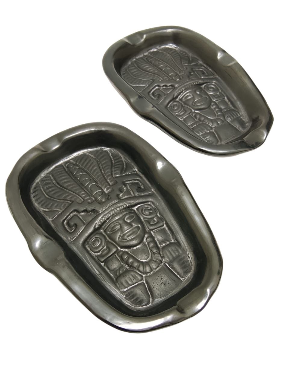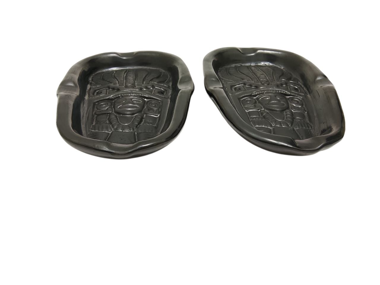 Par de Ceniceros circulares de barro negro, con acabado pulido con figura prehispanica Zapoteca en el centro, hecho a mano, en Oaxaca. Pieza artesanal. MEDIDAS; 14 cm de Largo x 10 Ancho x 2 cm de alt.