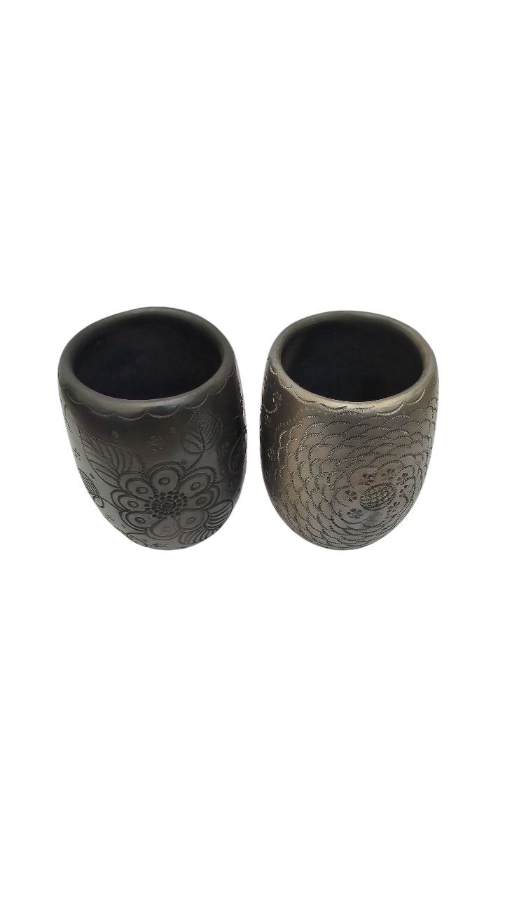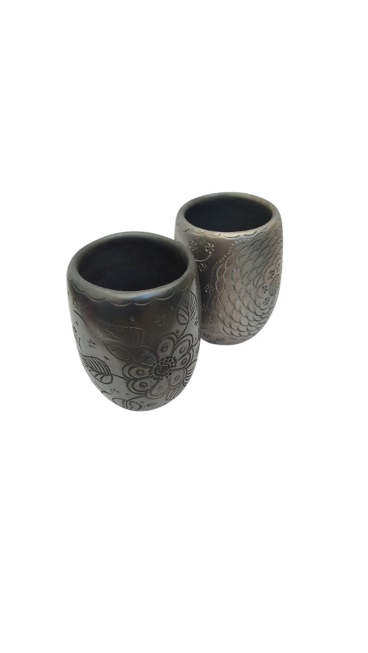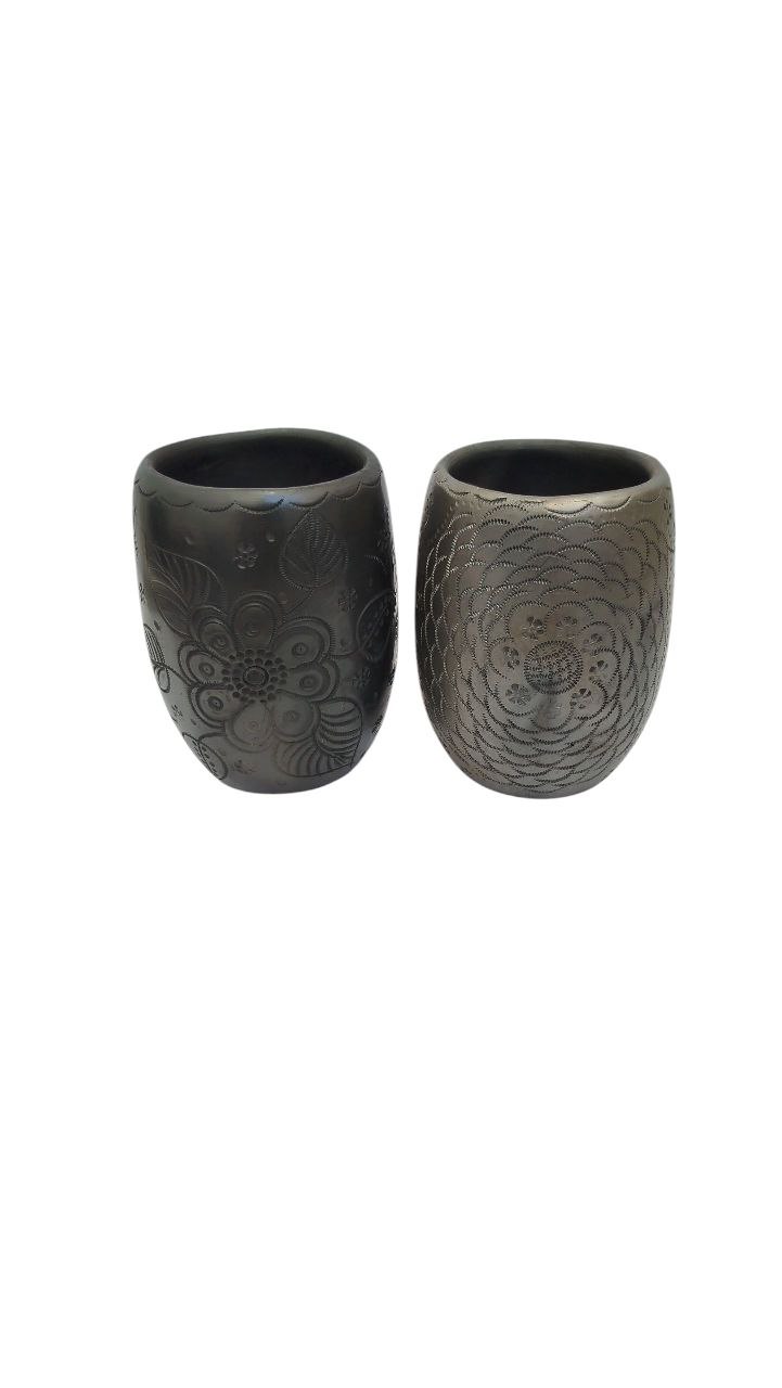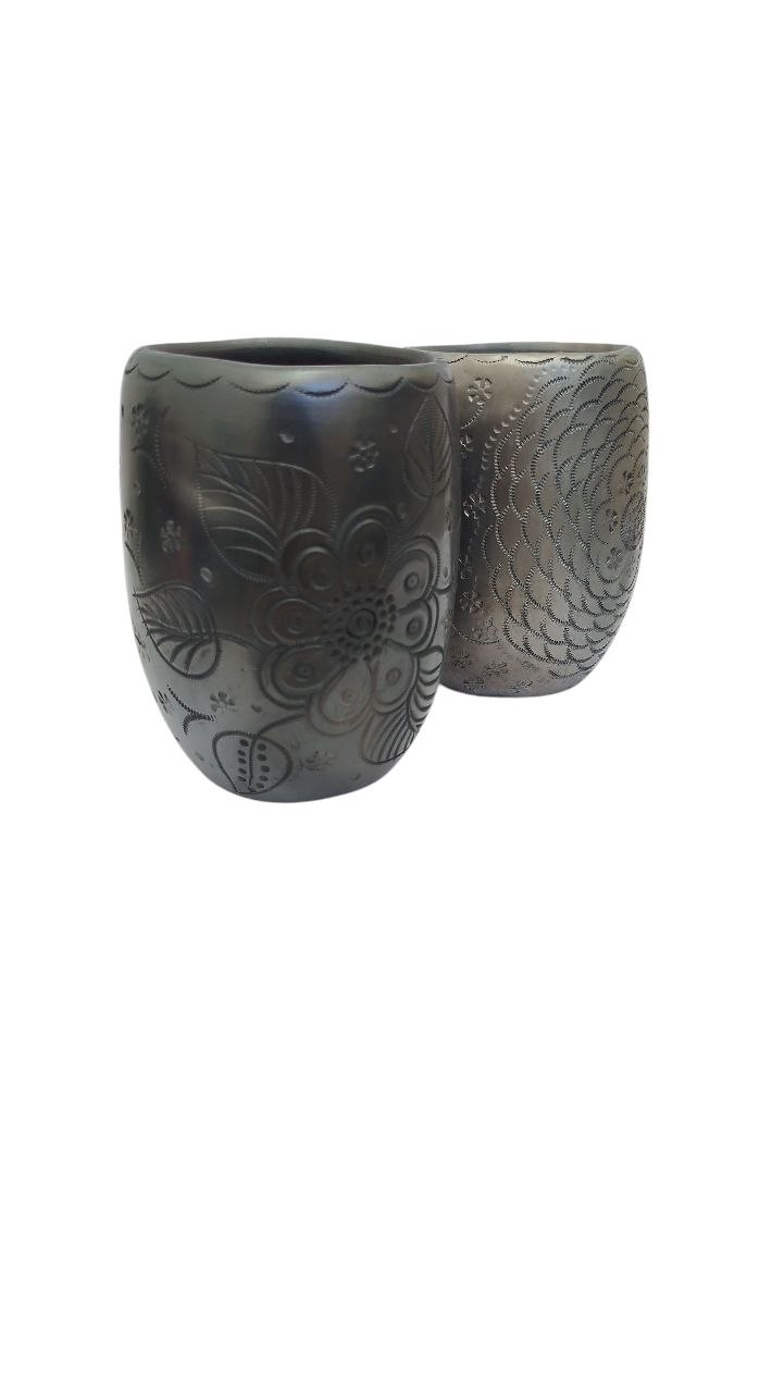 Dos vasos de barro negro terminado mate con decorado de rostro unico. Integra a tu vajilla es de par de vasos con deseño especial. MEDIDAS: 12 cm de alto * 8 cm de diametro .