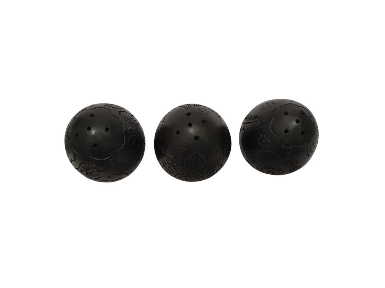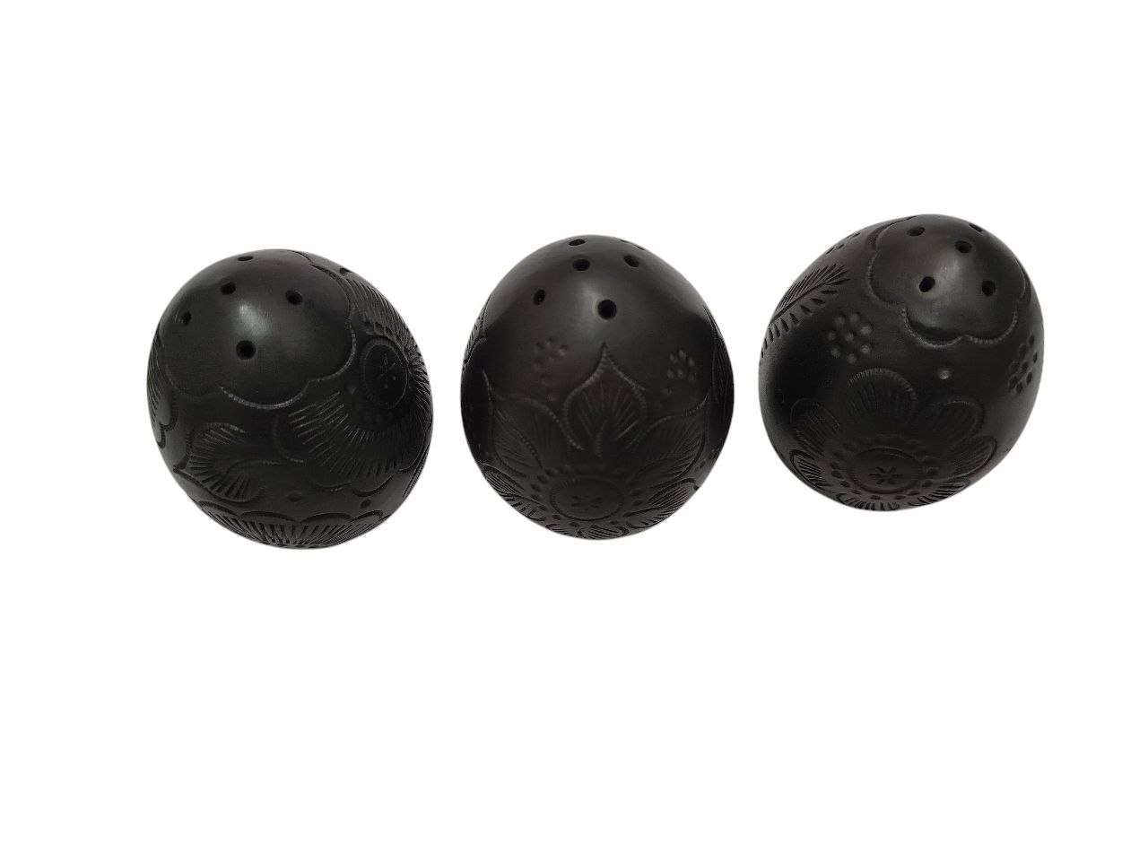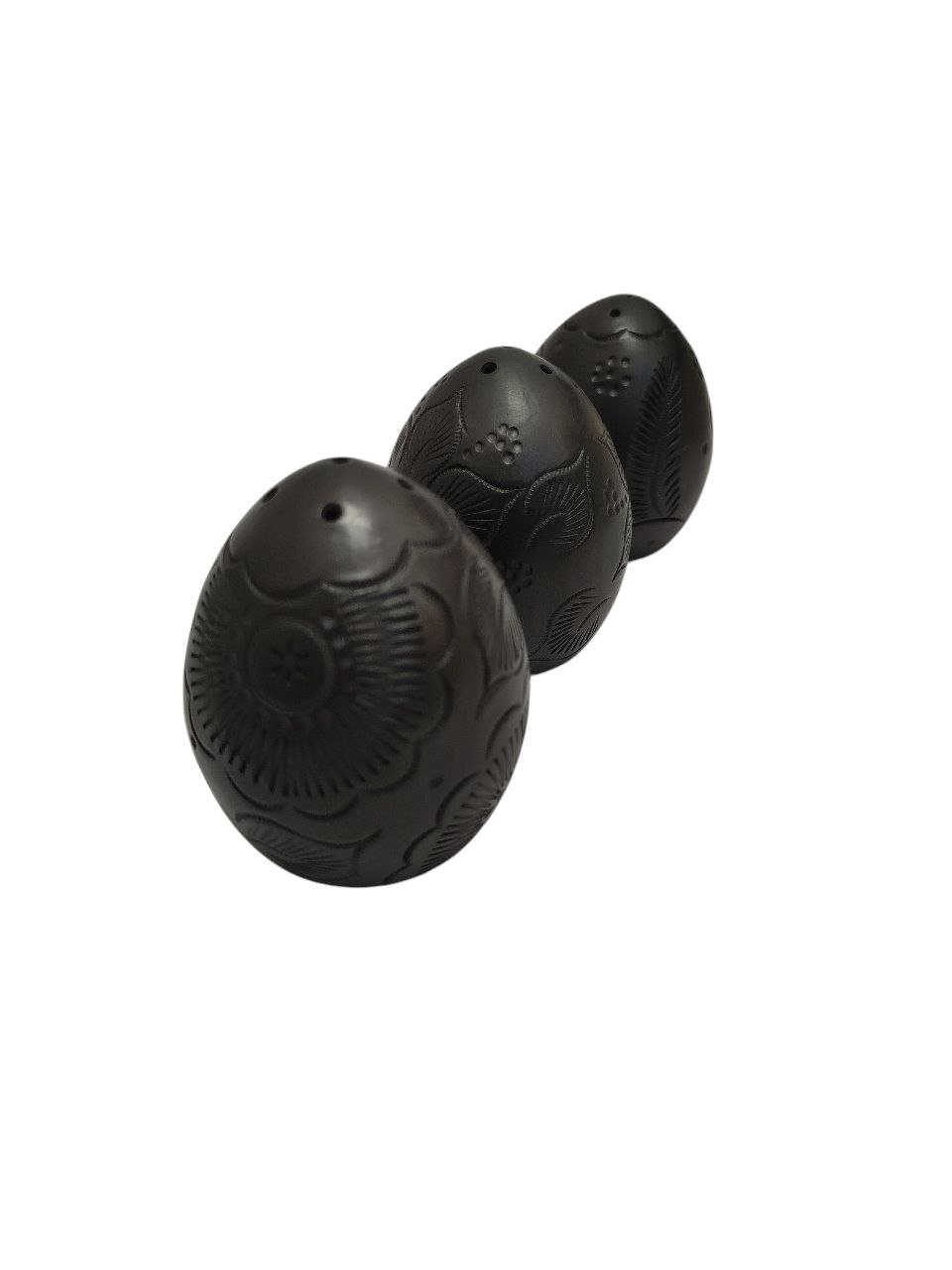 Juego de 3 saleros en Barro Negro, en forma de huevito, horneado en leña, grabado a mano, articulo de mesa. Miden 8 cm de altura * 5 cm diámetro.