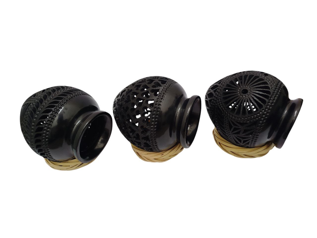 Juego de 3 cántaros calados, hecho a mano. Pieza pequeña. Mide 13 cm de largo * 10 cm de ancho y llevan una base de carrizo para que la pieza pueda postrarse por si sola. Perfecta como decoración o como regalo mexicano, NO aptos para almacenar líquidos. Regalo ideal para viaje al extranjero. Increíble para decoración de interiores.