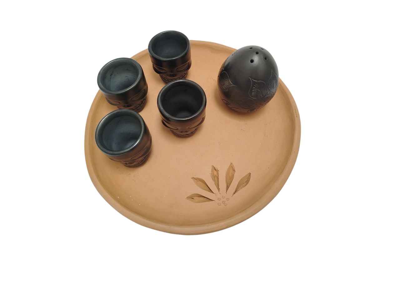 Incluye: 4 shots (5 cm). 1 Salero, 1 plato extendido (24cm). Nota: El barro tiende a absorber ligeramente líquidos.