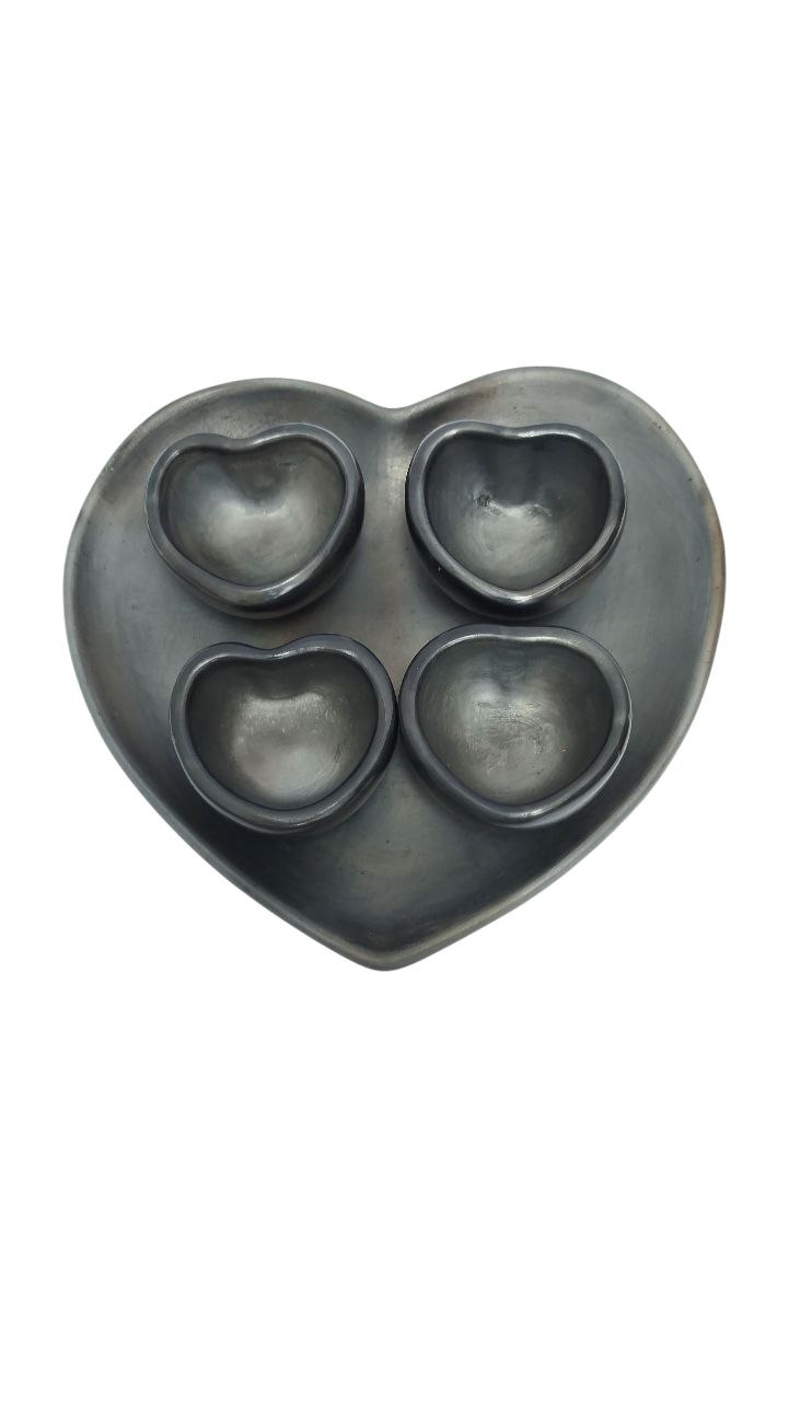 MEZCALERO ARTESANAL, 4 JICARITAS MEZCALERAS Y PLATO BASE DE BARRO NEGRO EN FORMA DE CORAZON (20cm) LULA’ NAYA’ NI.